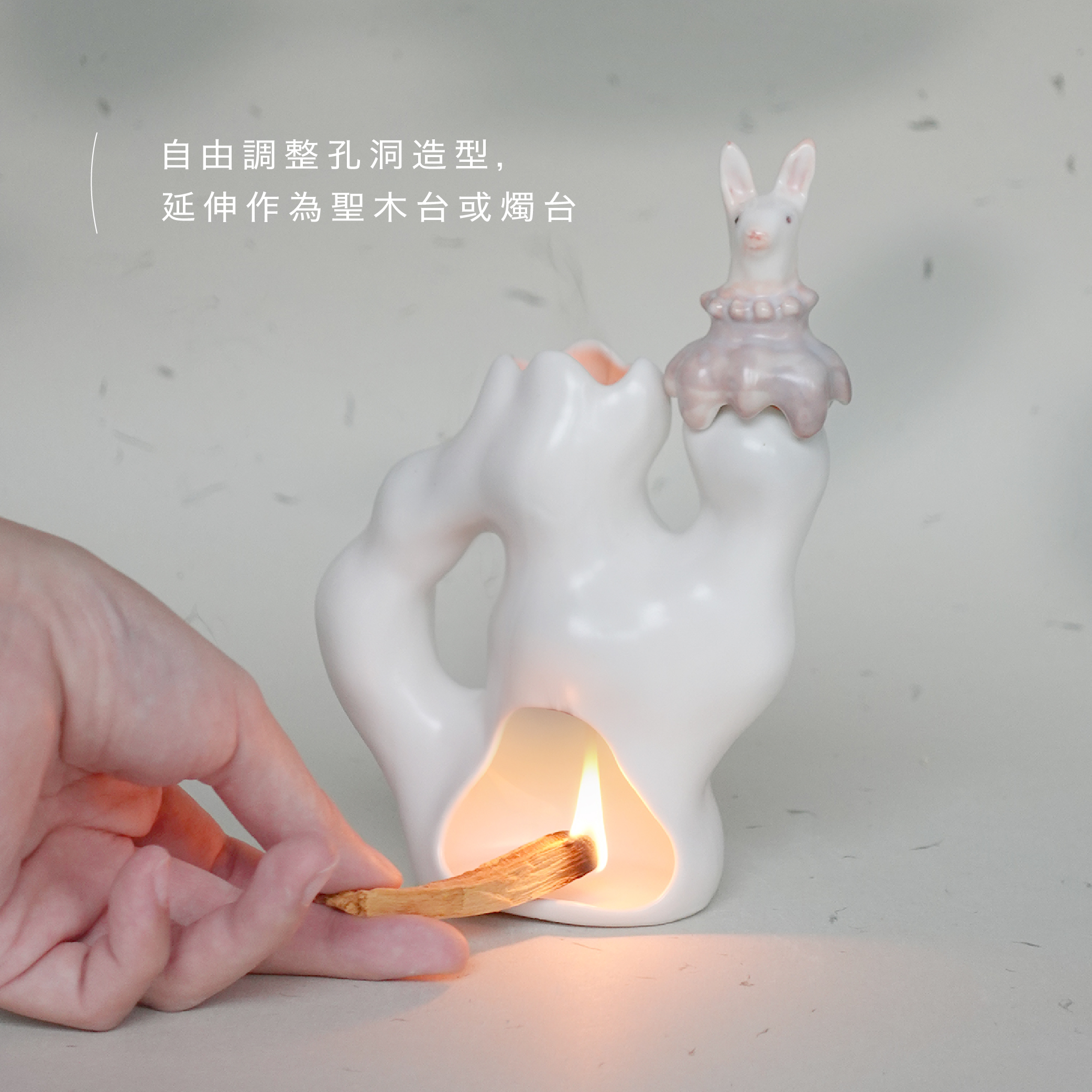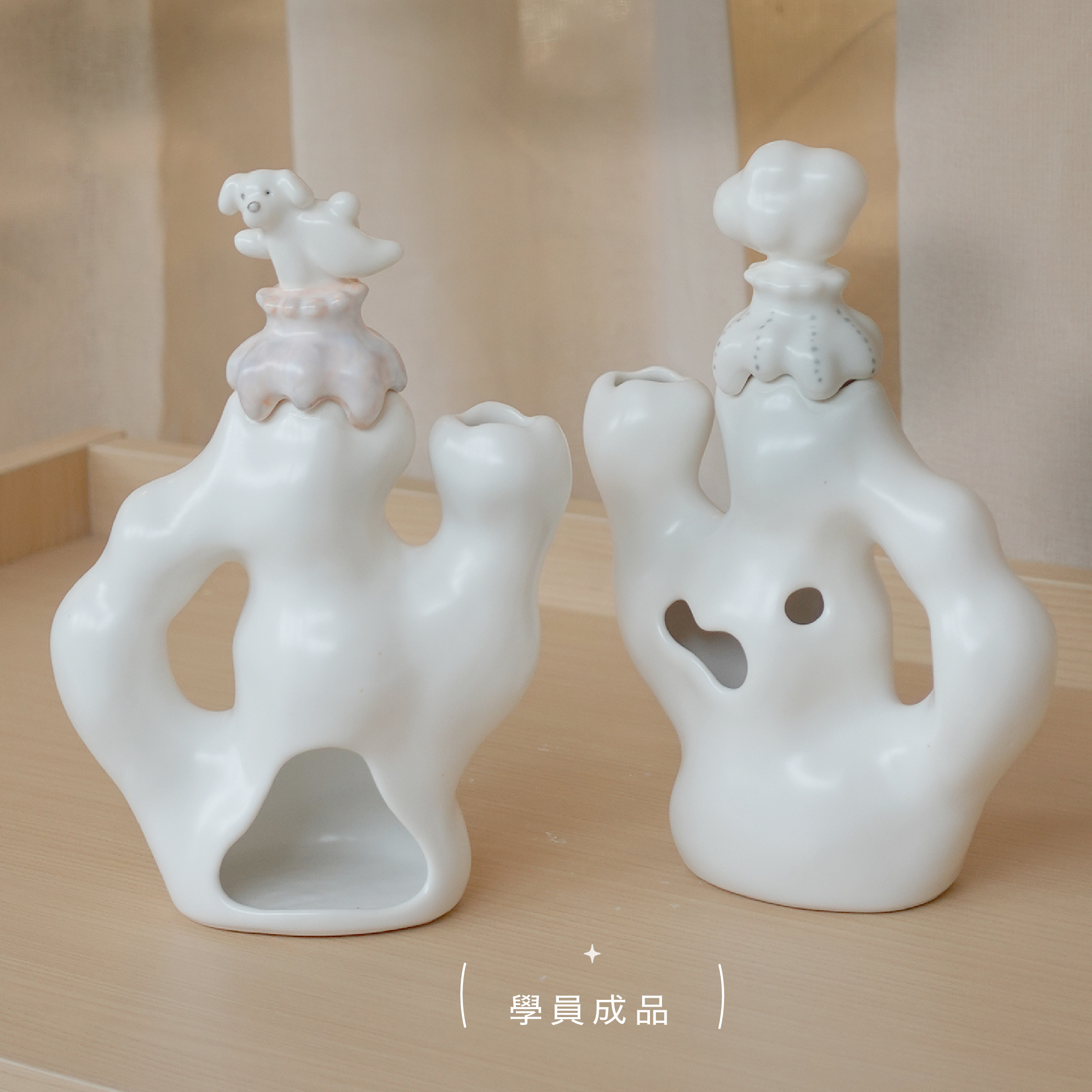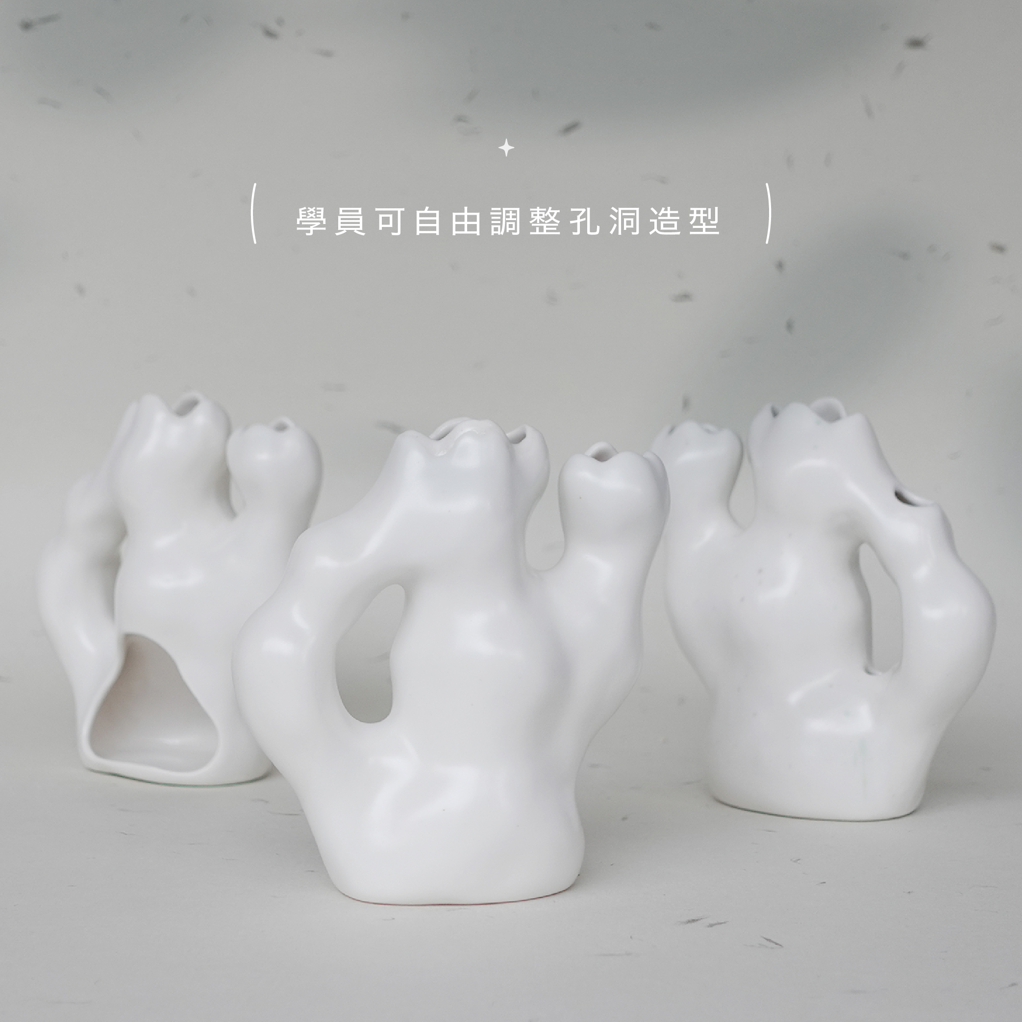 花器本體與瓶首皆以模具輔助成形,學員將先透過注漿製作出基本造型,再於脫模後自由進行挖洞、裝飾與上色。花器孔洞位置可依個人創作調整,也可延伸作為聖木台或燭台,兼具實用性與創作自由。